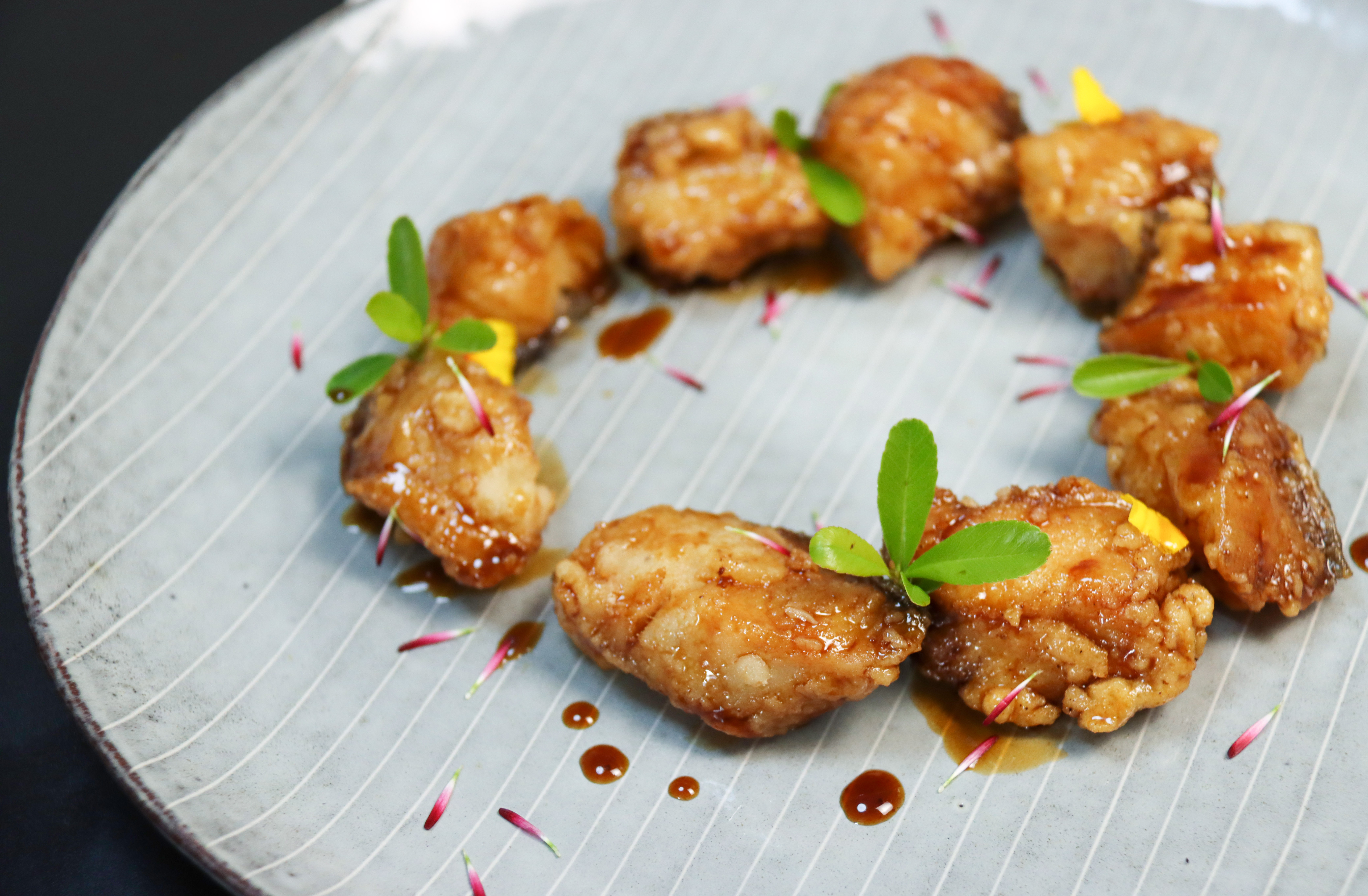 黑鱈魚改刀成塊,拍適量淀粉炸至表面金黃